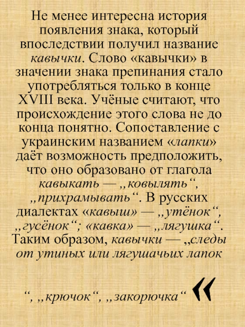Слайд 19Не менее интересна история появления знака, который впоследствии получил название кавычки.