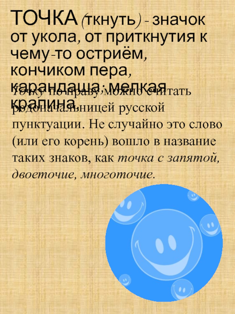 Слайд 10ТОЧКА (ткнуть) - значок от укола, от приткнутия к чему-то остриём,