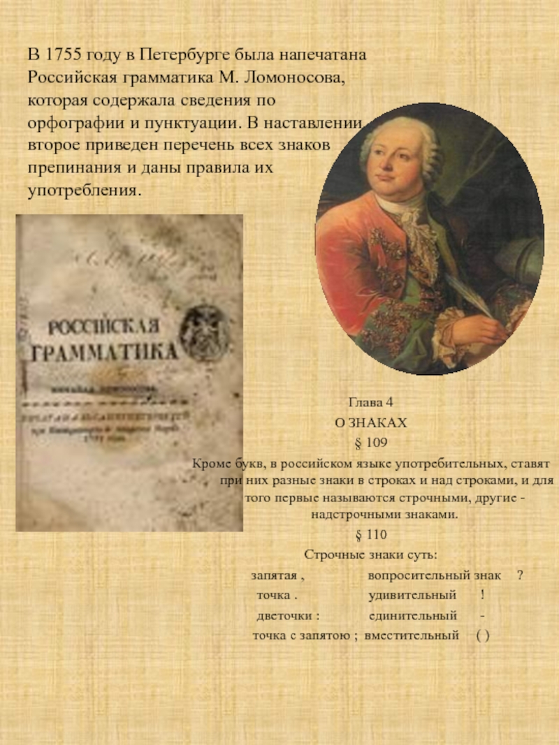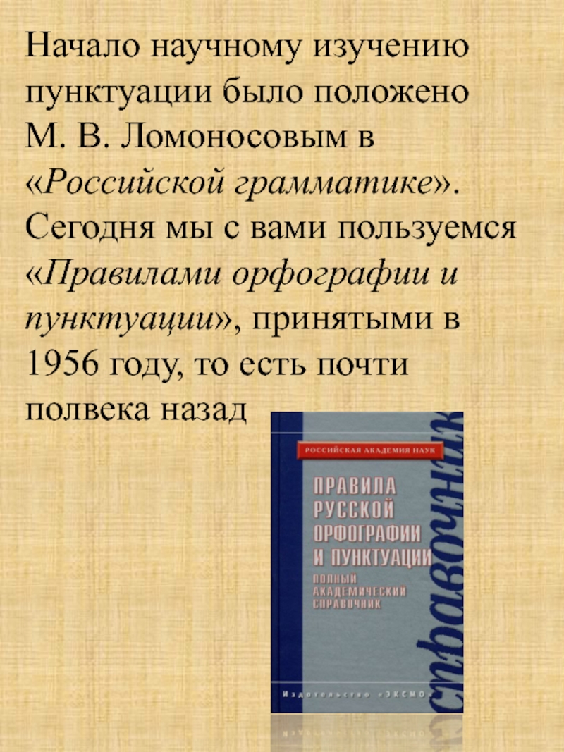 М. В. Ломоносовым в «Российской грамматике». Сегодня мы с вами пользуемся «Правилами орфографии и пунктуации», принятыми в 1956 году, то есть почти полвека назад