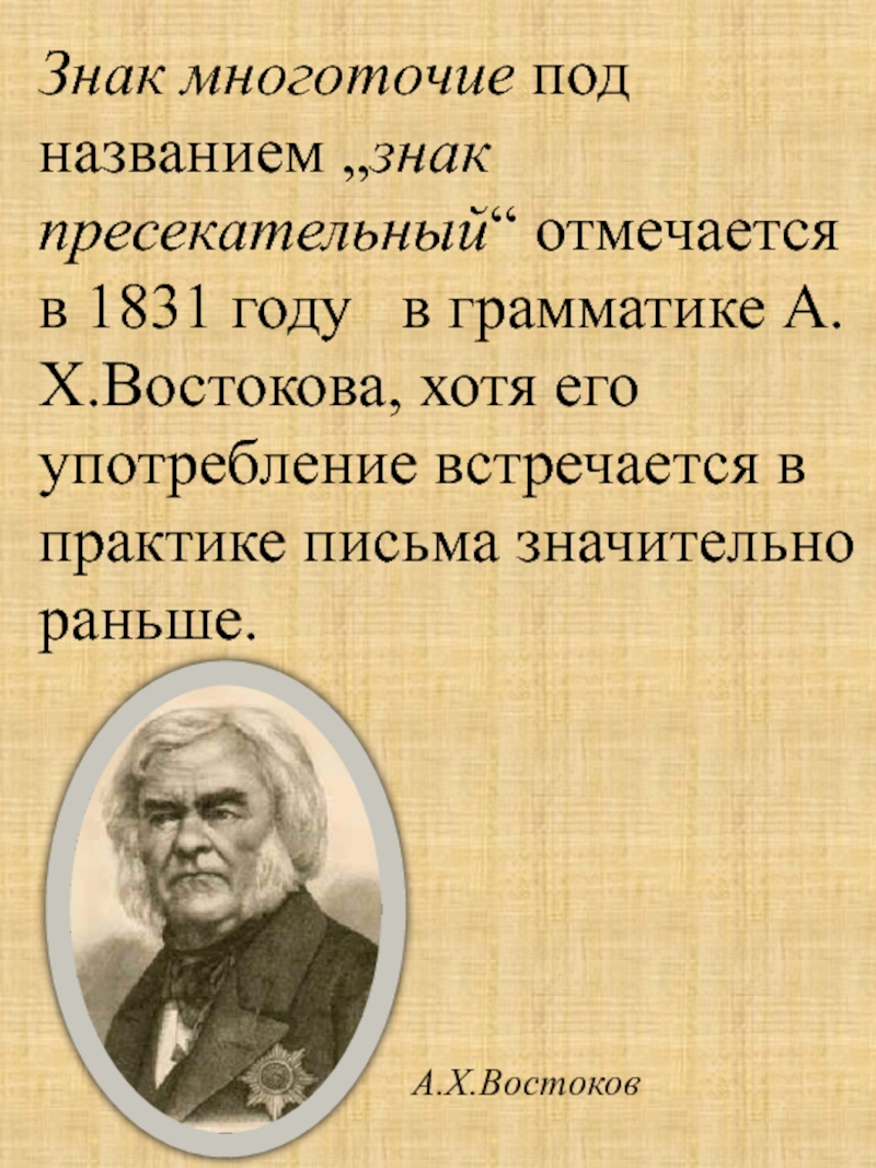 Слайд 18Знак многоточие под названием „знак пресекательный“ отмечается в 1831 году