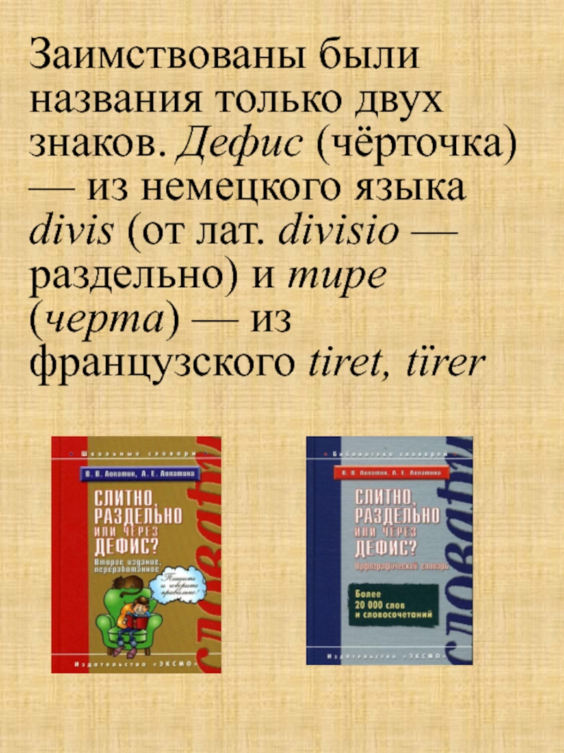 Слайд 7Заимствованы были названия только двух знаков. Дефис (чёрточка) — из немецкого