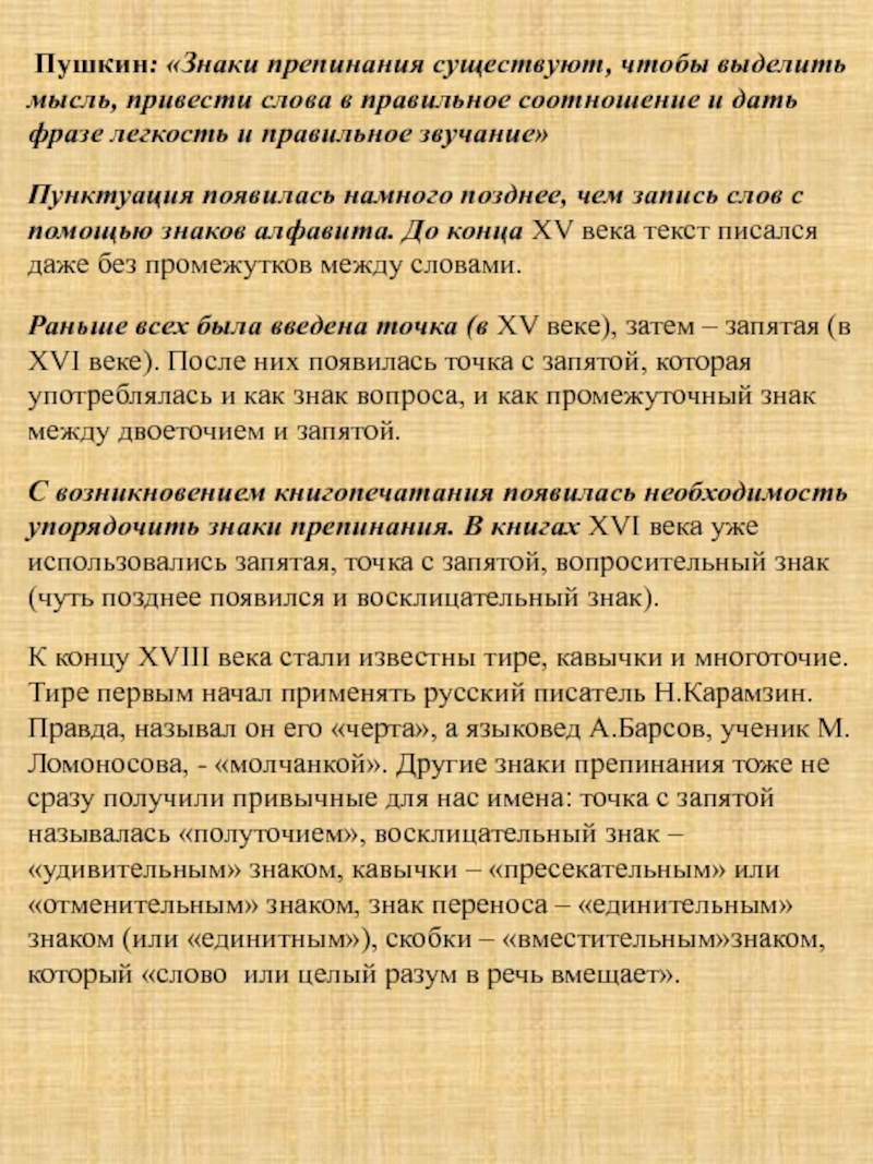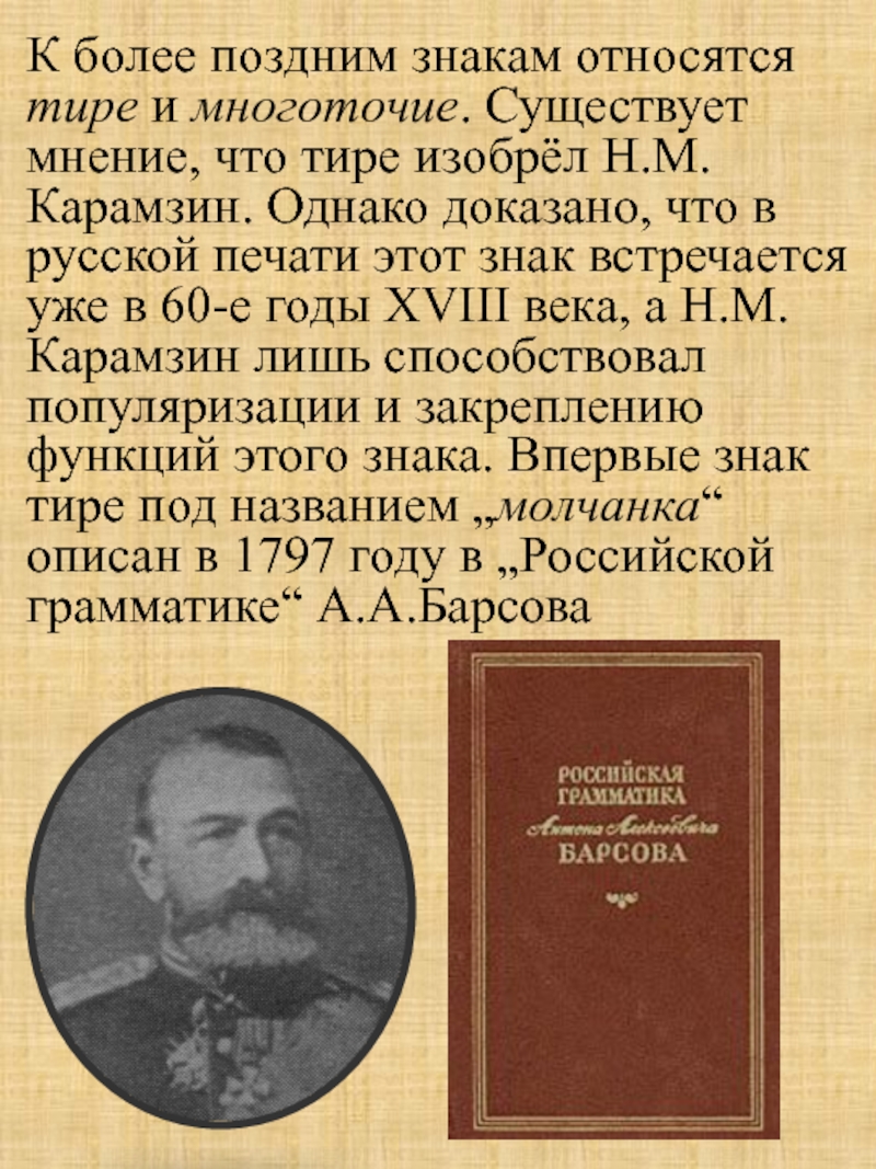 К концу XVIII века стали известны тире, кавычки и многоточие. Тире первым начал применять русский писатель Н.Карамзин. Правда, называл он его «черта», а языковед А.Барсов, ученик М. Ломоносова, - «молчанкой». Другие знаки препинания тоже не сразу получили привычные для нас имена: точка с запятой называлась «полуточием», восклицательный знак – «удивительным» знаком, кавычки – «пресекательным» или «отменительным» знаком, знак переноса – «единительным» знаком (или «единитным»), скобки – «вместительным»знаком, который «слово или целый разум в речь вмещает».
