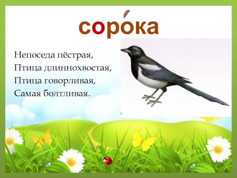 сорокаНепоседа пёстрая,Птица длиннохвостая,Птица говорливая,Самая болтливая.