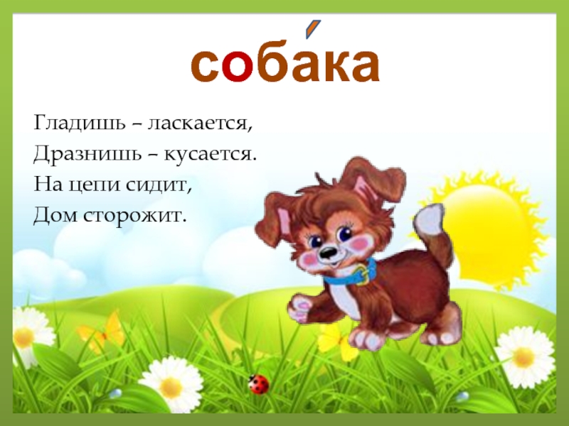 собакаГладишь – ласкается,Дразнишь – кусается.На цепи сидит,Дом сторожит.