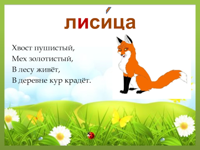 лисицаХвост пушистый,Мех золотистый,В лесу живёт,В деревне кур крадёт.