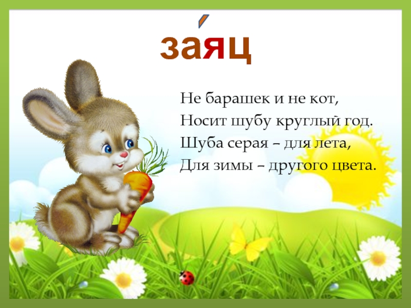 заяцНе барашек и не кот,Носит шубу круглый год.Шуба серая – для лета,Для зимы – другого цвета.