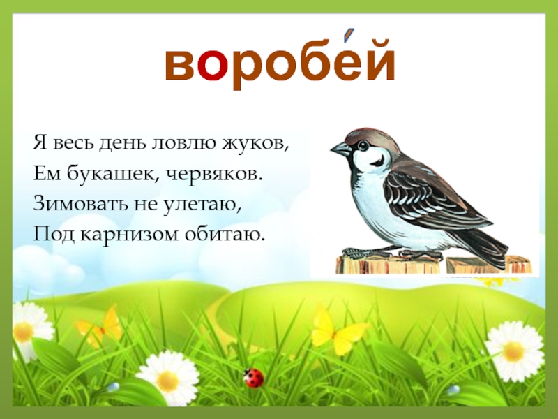 воробейЯ весь день ловлю жуков,Ем букашек, червяков.Зимовать не улетаю,Под карнизом обитаю.