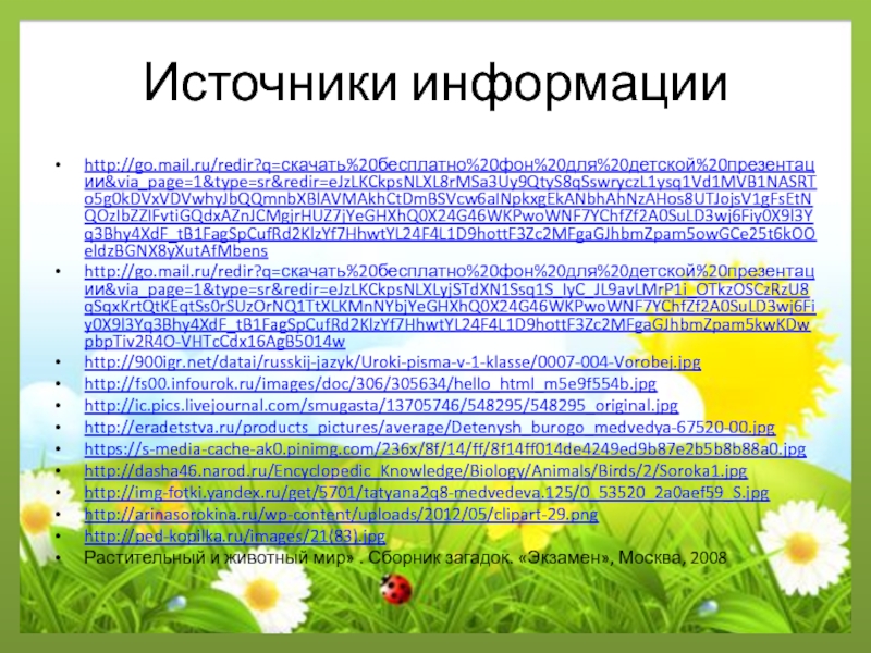 Источники информации http://go.mail.ru/redir?q=скачать%20бесплатно%20фон%20для%20детской%20презентации&via_page=1&type=sr&redir=eJzLKCkpsNLXL8rMSa3Uy9QtyS8qSswryczL1ysq1Vd1MVB1NASRTo5g0kDVxVDVwhyJbQQmnbXBlAVMAkhCtDmBSVcw6aINpkxgEkANbhAhNzAHos8UTJojsV1gFsEtNQOzIbZZIFvtiGQdxAZnJCMgjrHUZ7jYeGHXhQ0X24G46WKPwoWNF7YChfZf2A0SuLD3wj6Fiy0X9l3Yq3Bhy4XdF_tB1FagSpCufRd2KlzYf7HhwtYL24F4L1D9hottF3Zc2MFgaGJhbmZpam5owGCe25t6kOOeldzBGNX8yXutAfMbenshttp://go.mail.ru/redir?q=скачать%20бесплатно%20фон%20для%20детской%20презентации&via_page=1&type=sr&redir=eJzLKCkpsNLXLyjSTdXN1Ssq1S_IyC_JL9avLMrP1i_OTkzOSCzRzU8qSqxKrtQtKEqtSs0rSUzOrNQ1TtXLKMnNYbjYeGHXhQ0X24G46WKPwoWNF7YChfZf2A0SuLD3wj6Fiy0X9l3Yq3Bhy4XdF_tB1FagSpCufRd2KlzYf7HhwtYL24F4L1D9hottF3Zc2MFgaGJhbmZpam5kwKDwpbpTiv2R4O-VHTcCdx16AgB5014whttp://900igr.net/datai/russkij-jazyk/Uroki-pisma-v-1-klasse/0007-004-Vorobej.jpghttp://fs00.infourok.ru/images/doc/306/305634/hello_html_m5e9f554b.jpghttp://ic.pics.livejournal.com/smugasta/13705746/548295/548295_original.jpghttp://eradetstva.ru/products_pictures/average/Detenysh_burogo_medvedya-67520-00.jpghttps://s-media-cache-ak0.pinimg.com/236x/8f/14/ff/8f14ff014de4249ed9b87e2b5b8b88a0.jpghttp://dasha46.narod.ru/Encyclopedic_Knowledge/Biology/Animals/Birds/2/Soroka1.jpghttp://img-fotki.yandex.ru/get/5701/tatyana2q8-medvedeva.125/0_53520_2a0aef59_S.jpghttp://arinasorokina.ru/wp-content/uploads/2012/05/clipart-29.pnghttp://ped-kopilka.ru/images/21(83).jpgРастительный и животный мир» . Сборник загадок. «Экзамен», Москва, 2008