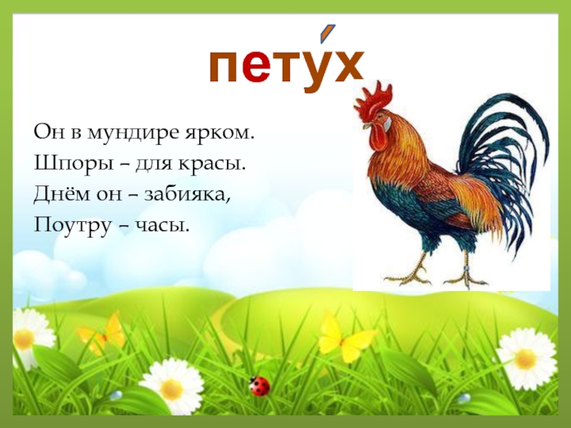 петухОн в мундире ярком.Шпоры – для красы.Днём он – забияка,Поутру – часы.