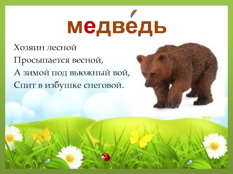 медведьХозяин леснойПросыпается весной,А зимой под вьюжный вой,Спит в избушке снеговой.