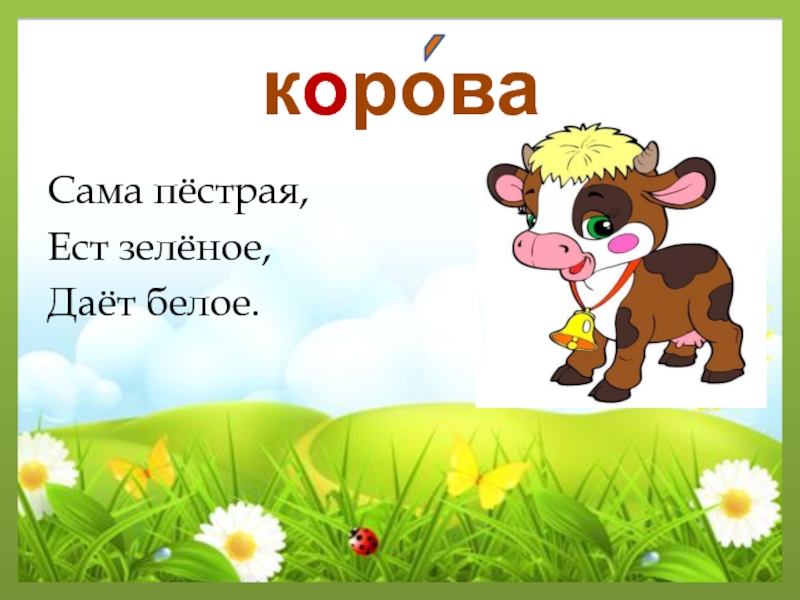 короваСама пёстрая,Ест зелёное,Даёт белое.