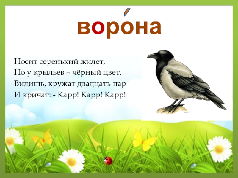 воронаНосит серенький жилет,Но у крыльев – чёрный цвет.Видишь, кружат двадцать парИ кричат: - Карр! Карр! Карр!