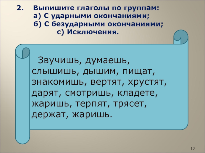 - если этот глагол - исключение (слышать, дышать, держать, гнать, видеть, обидеть, смотреть, зависеть, вертеть, терпеть, ненавидеть), то он –2 спряжения.