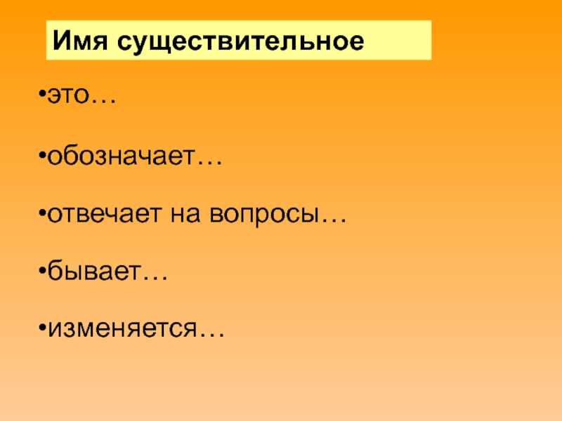 Имя существительноеэто…обозначает…отвечает на вопросы…бывает…изменяется…