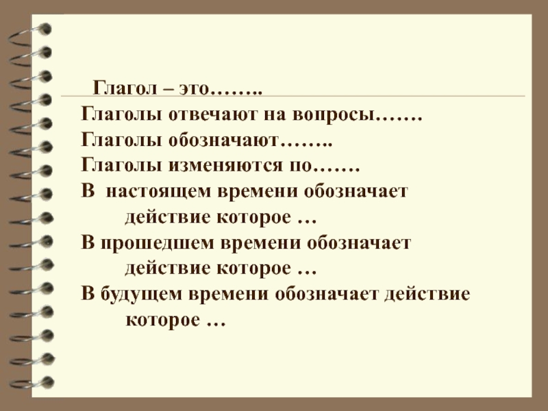 цать второе апреля.лГлагол – это……..Глаголы отвечают на вопросы…….Глаголы обозначают……..Глаголы изменяются по…….В настоящем времени обозначает действие которое …В