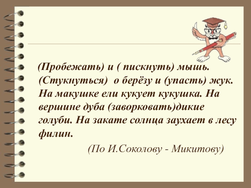 (Пробежать) и ( пискнуть) мышь. (Стукнуться) о берёзу и (упасть) жук. На макушке ели кукует