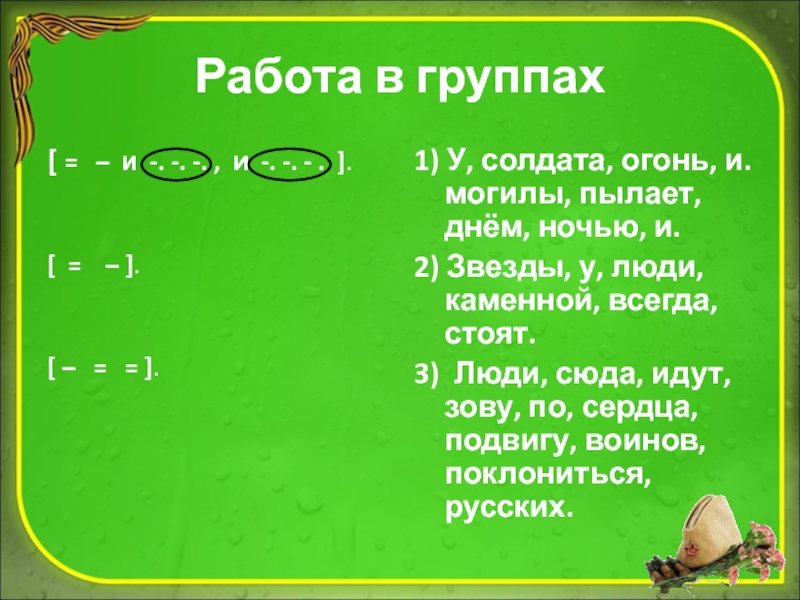 1) У, солдата, огонь, и. могилы, пылает, днём, ночью, и.