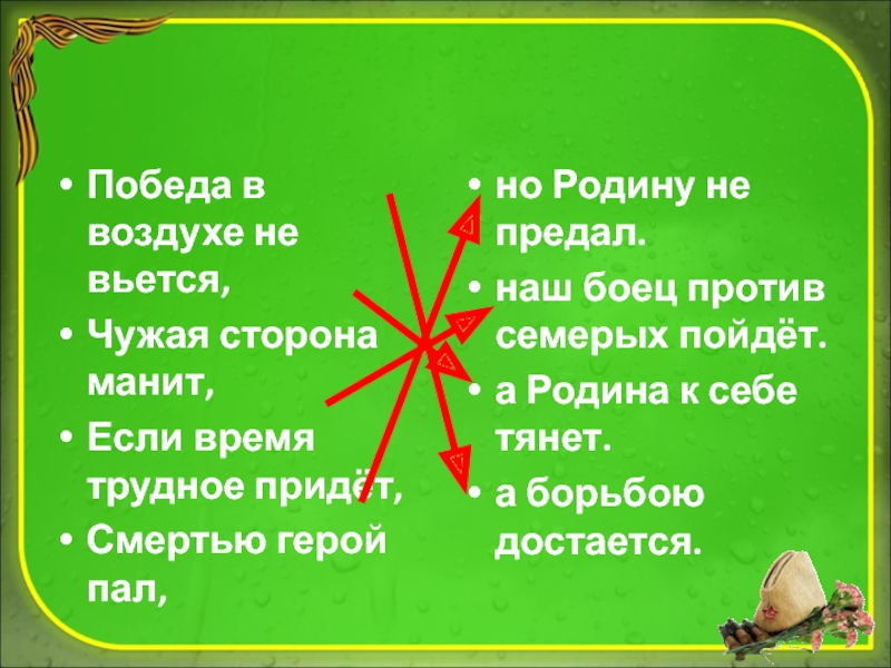 3) Люди, сюда, идут, зову, по, сердца, подвигу, воинов, поклониться, русских.