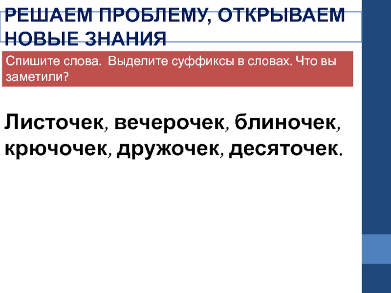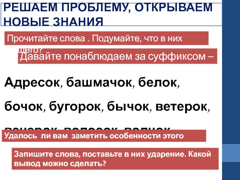 Адресок, башмачок, белок, бочок, бугорок, бычок, ветерок, вечерок, волосок, волчок.
