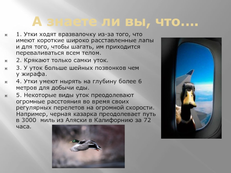 5. Некоторые виды уток преодолевают огромные расстояния во время своих регулярных перелетов на огромной скорости. Например, черная казарка преодолевает путь в 3000 миль из Аляски в Калифорнию за 72 часа.