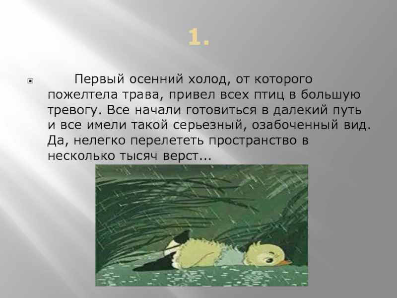 от которого пожелтела трава, привел всех птиц в большую тревогу. Все начали готовиться в далекий путь и все имели такой серьезный, озабоченный вид. Да, нелегко перелететь пространство в несколько тысяч верст...