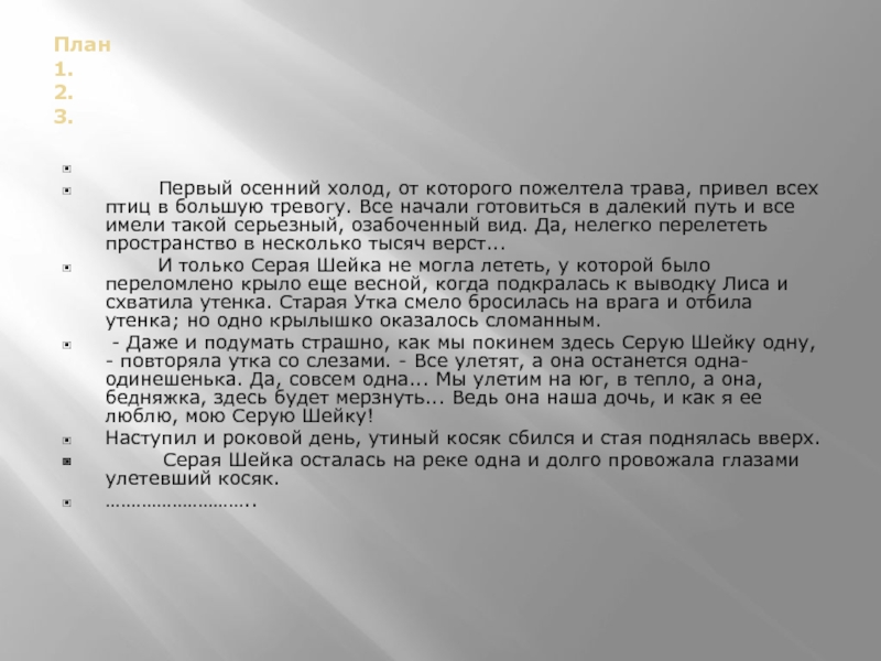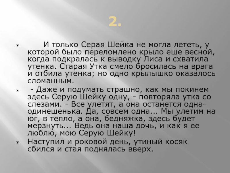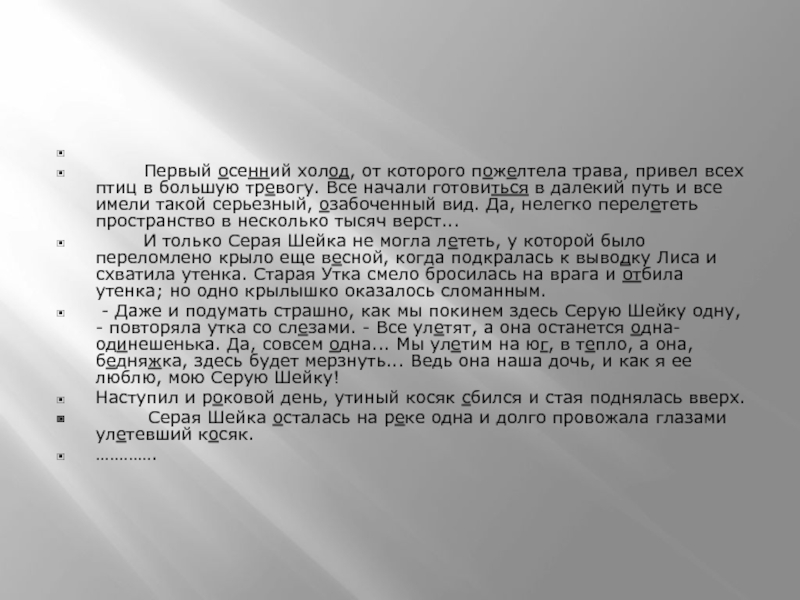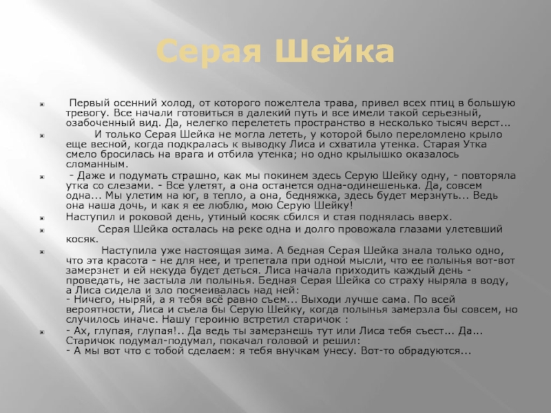 И только Серая Шейка не могла лететь, у которой было переломлено крыло еще весной, когда подкралась к выводку Лиса и схватила утенка. Старая Утка смело бросилась на врага и отбила утенка; но одно крылышко оказалось сломанным.