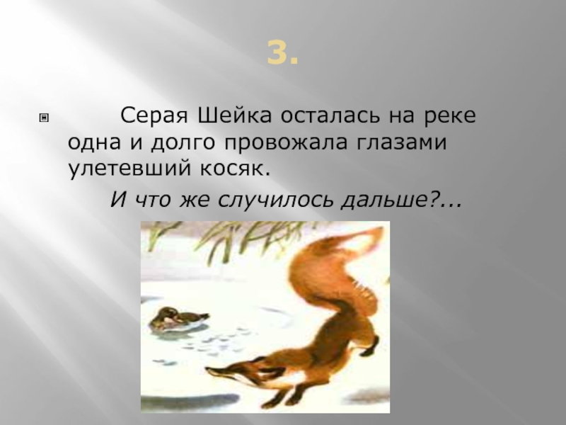 - Ничего, ныряй, а я тебя всё равно съем... Выходи лучше сама. По всей вероятности, Лиса и съела бы Серую Шейку, когда полынья замерзла бы совсем, но случилось иначе. Нашу героиню встретил старичок :