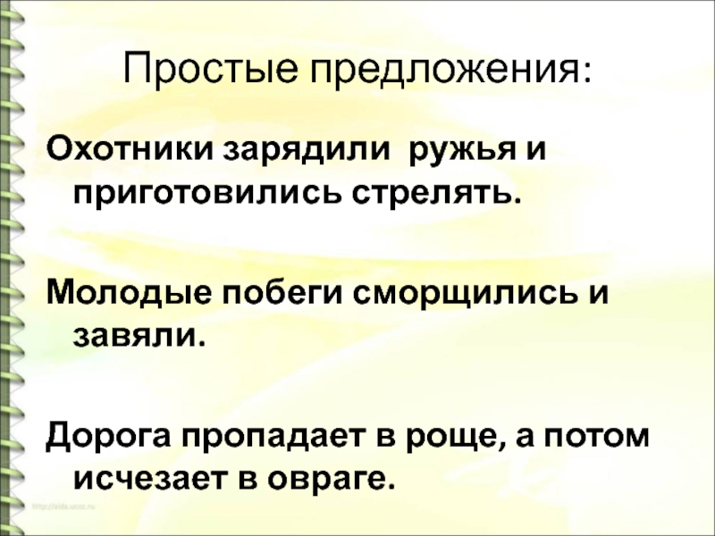 Простые предложения:Охотники зарядили ружья и приготовились стрелять. Молодые побеги сморщились и завяли.Дорога пропадает в роще, а потом исчезает