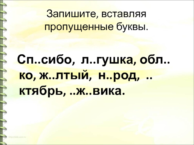 Сп..сибо, л..гушка, обл..ко, ж..лтый, н..род, ..ктябрь,