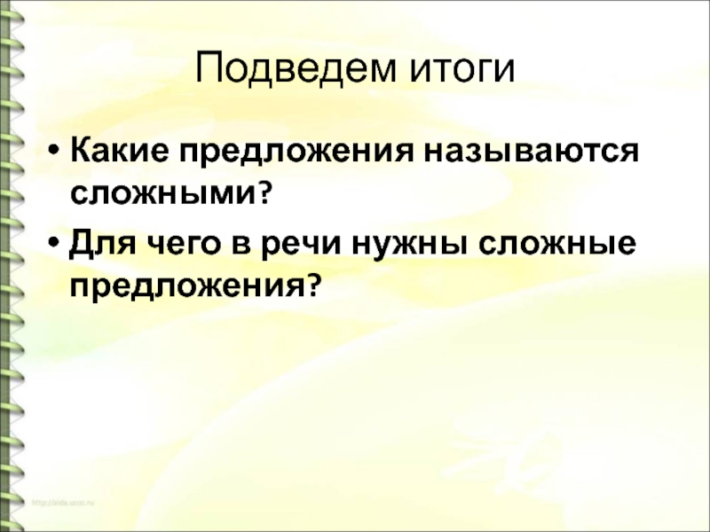Подведем итоги Какие предложения называются сложными?Для чего в речи нужны сложные предложения?