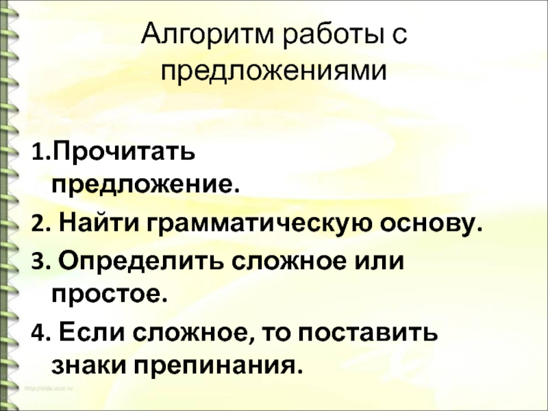 Алгоритм работы с предложениями1.Прочитать предложение.                      2. Найти