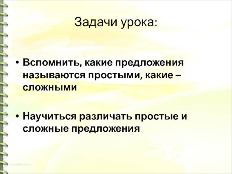 Задачи урока:Вспомнить, какие предложения называются простыми, какие – сложнымиНаучиться различать простые и сложные предложения