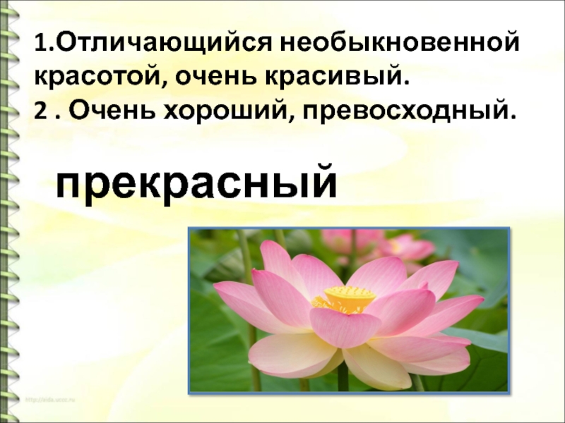 Слайд 161.Отличающийся необыкновенной красотой, очень красивый. 2 . Очень хороший, превосходный.