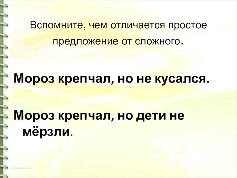 Вспомните, чем отличается простое предложение от сложного. Мороз крепчал, но не кусался.Мороз крепчал, но дети не мёрзли.