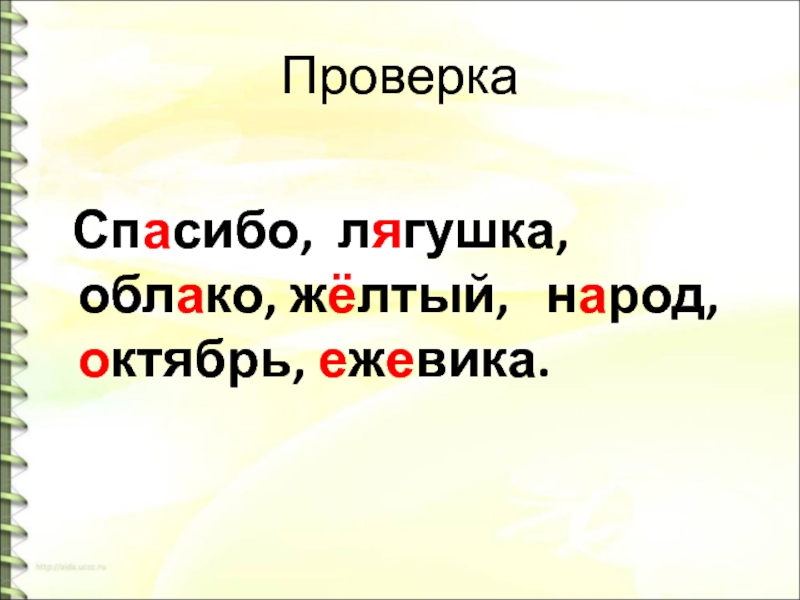 Проверка   Спасибо, лягушка, облако, жёлтый,  народ, октябрь, ежевика.
