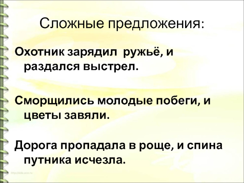 Сложные предложения:Охотник зарядил ружьё, и раздался выстрел. Сморщились молодые побеги, и цветы завяли. Дорога пропадала в роще, и