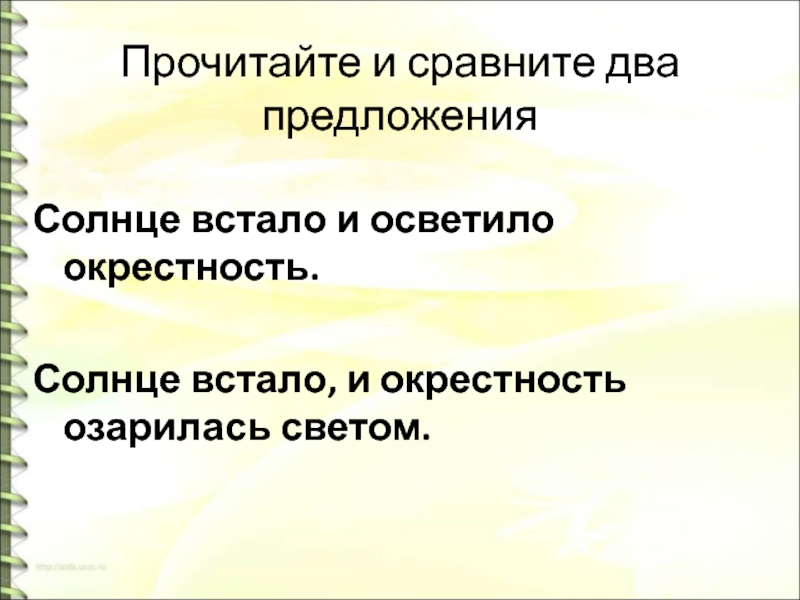 Прочитайте и сравните два предложенияСолнце встало и осветило окрестность.Солнце встало, и окрестность озарилась светом.