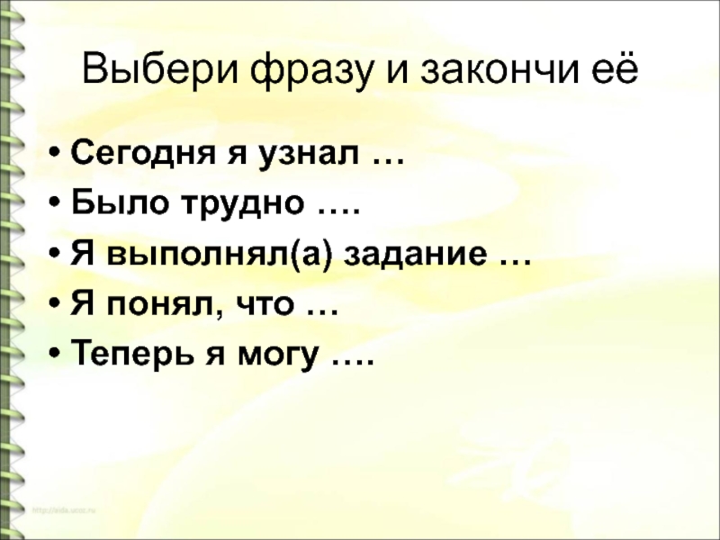 Выбери фразу и закончи еёСегодня я узнал …Было трудно ….Я выполнял(а) задание …Я понял, что …Теперь я