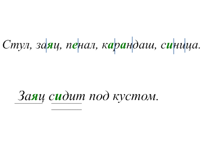 Стул, заяц, пенал, карандаш, синица.Заяц сидит под кустом.___________________________________