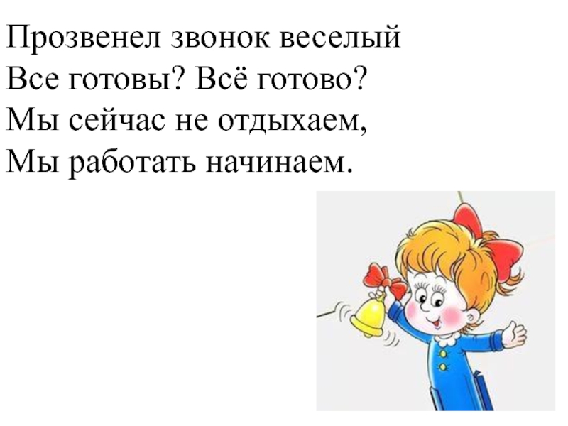 Прозвенел звонок веселый Все готовы? Всё готово? Мы сейчас не отдыхаем, Мы работать начинаем.