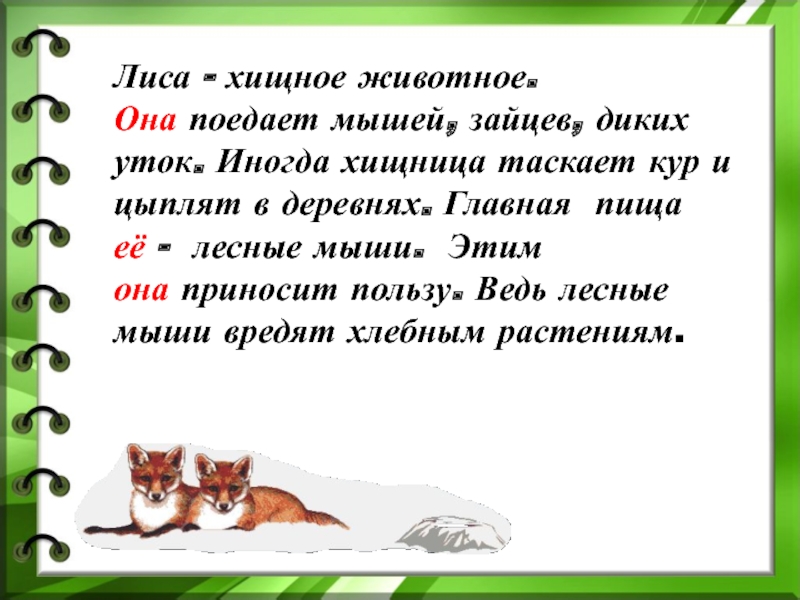 хищница таскает кур и цыплят в деревнях. Главная пища лисы - лесные мыши. Этим лиса приносит пользу. Ведь лесные мыши вредят хлебным растениям.