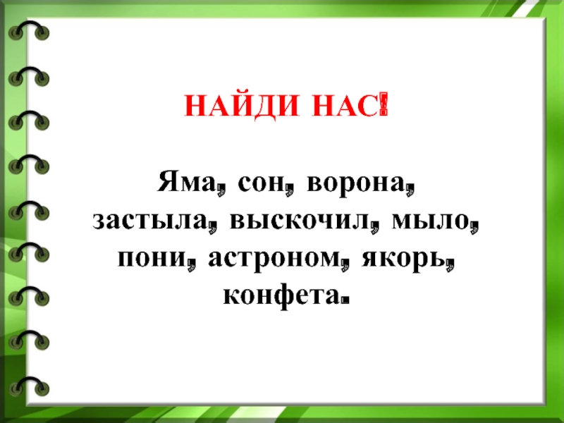 НАЙДИ НАС! Яма, сон, ворона, застыла, выскочил, мыло, пони, астроном, якорь, конфета.