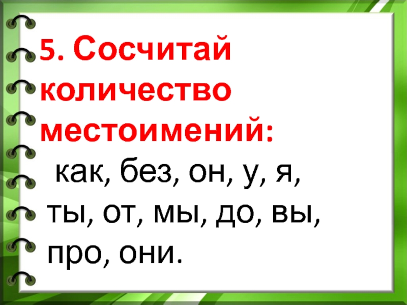 5. Сосчитай количество местоимений:  как, без, он, у, я, ты, от, мы, до, вы, про, они.