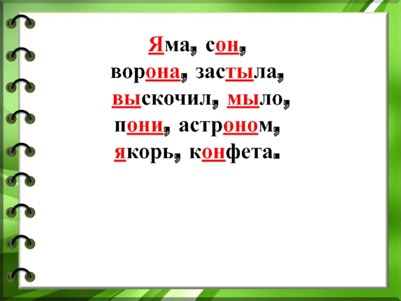 Яма, сон, ворона, застыла, выскочил, мыло, пони, астроном, якорь, конфета.