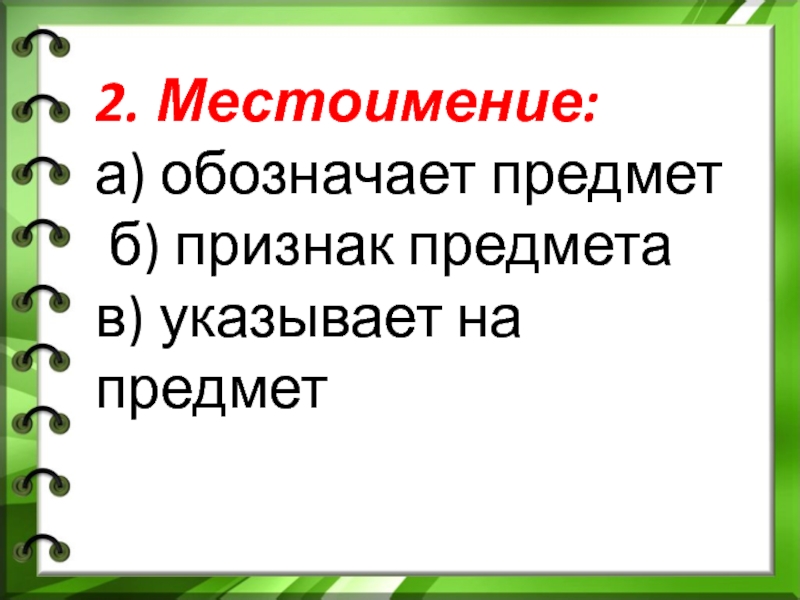 2. Местоимение:  а) обозначает предмет б) признак предмета в) указывает на предмет