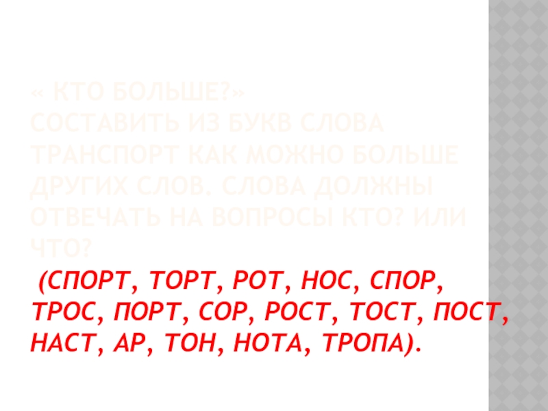 Составить из букв слова ТРАНСПОРТ как можно больше других