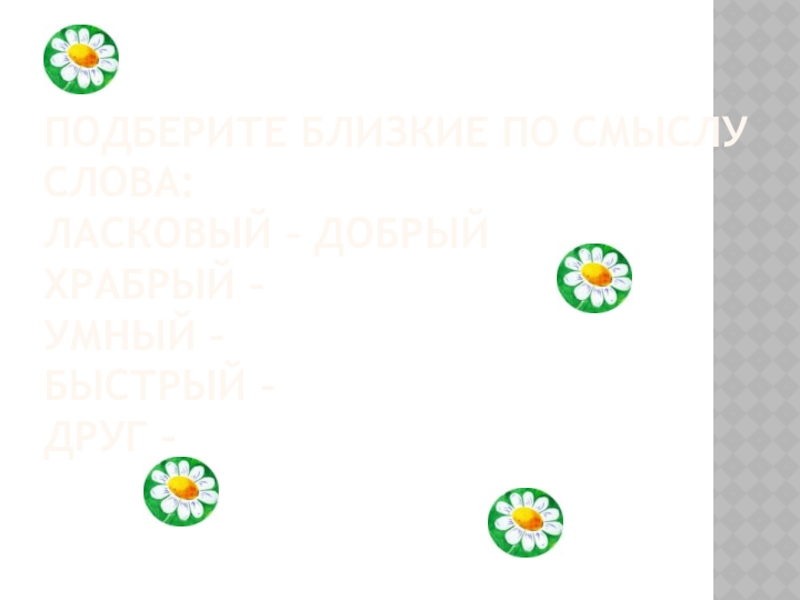 Слайд 12Подберите близкие по смыслу слова: