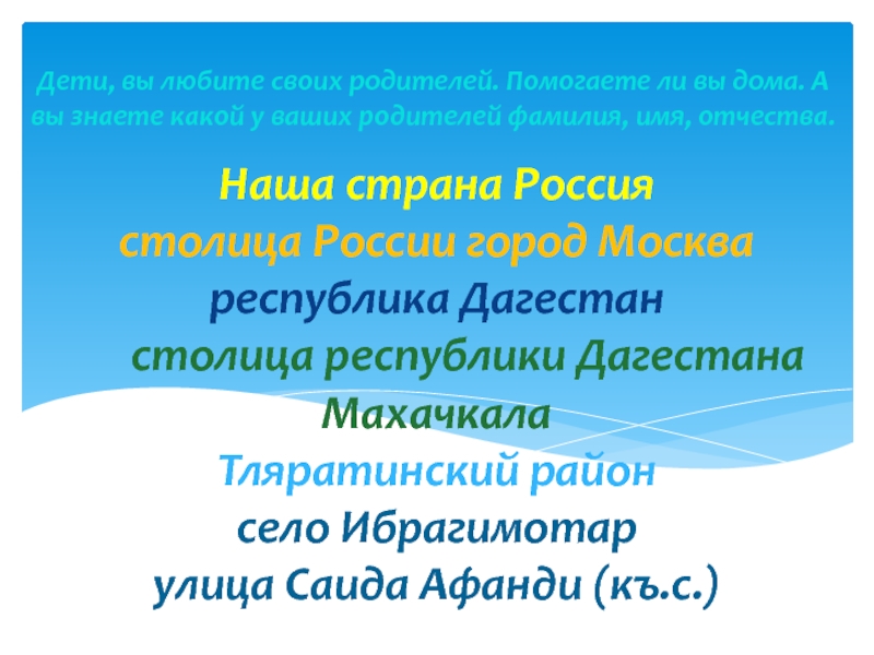 Дети, вы любите своих родителей. Помогаете ли вы дома. А вы знаете какой у ваших родителей фамилия, имя, отчества.