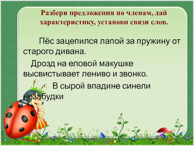 Слайд 12Разбери предложения по членам, дай характеристику, установи связи слов.