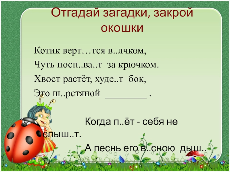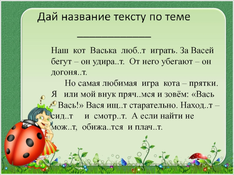 Слайд 5Наш кот Васька люб..т играть. За Васей бегут – он удира..т.